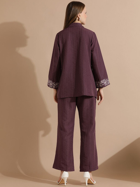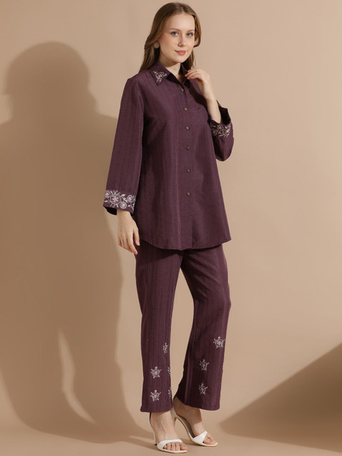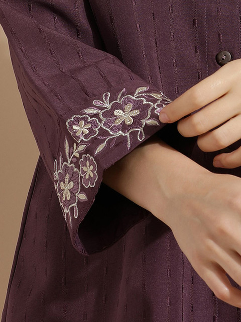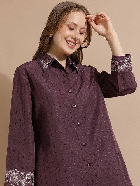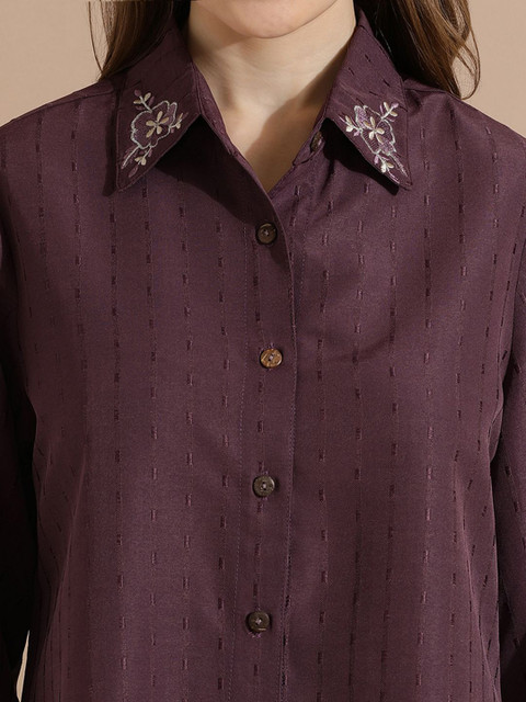 Violet floral Embroidered Shirt, has Shirt collar, Full-sleeves, button closure