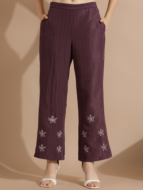 Violet floral Embroidered mid-rise Trouser, has slip-on closure