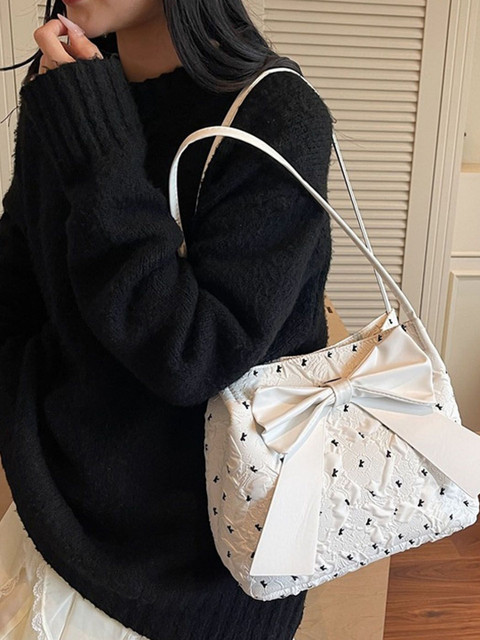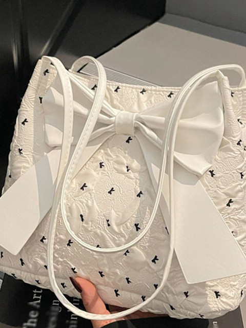 White graphic printed hobo bag 1 main compartment, has a zip closure, na external pockets, multiple inner pockets
