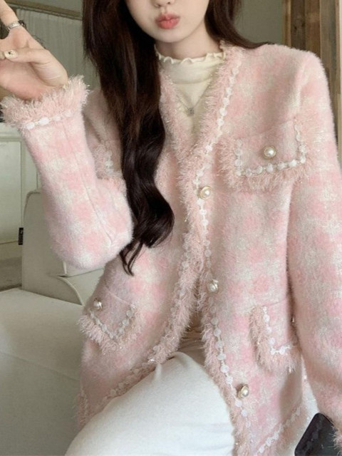 Pink checked open front jacket, has a collarless, 4 pockets ,has a button closure, long sleeves, straight hemline, without lining