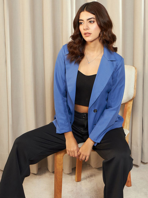 Blue solid regular-fit smart-casual blazer, has a notched lapel, long sleeves, single-breasted with double button closure, two flap pockets, one welt pocket and a double-vented back hem