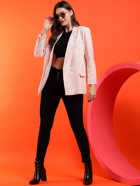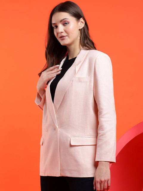 Beige solid regular fit double-breasted blazer, has a notched lapel collar, long sleeves, single vent, button closure with straight hem & two pockets
