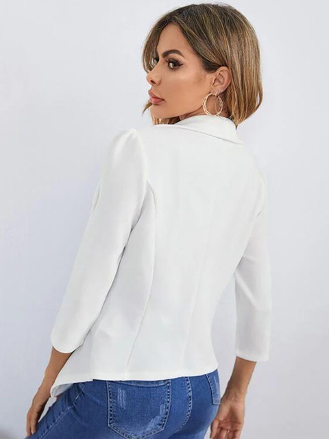 White solid regular-fit smart-casual blazer, has a shawl collar, three quarter sleeves, open front, with puff sleeves