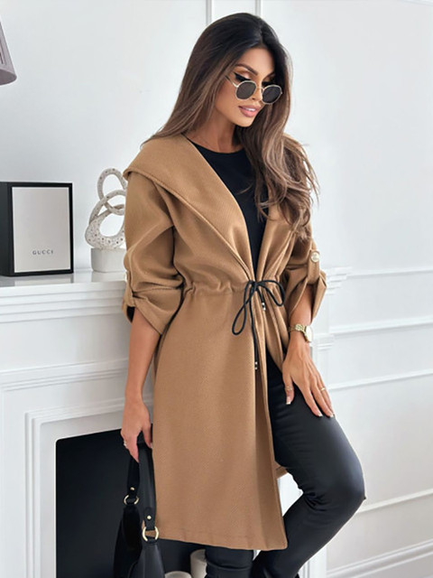 Khaki solid single-breasted overcoat, has v-neck, long sleeves, tie-upclosure, a straight hem