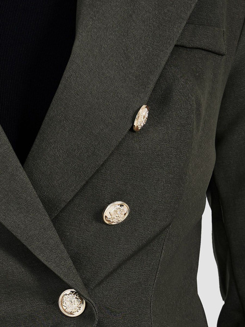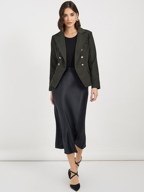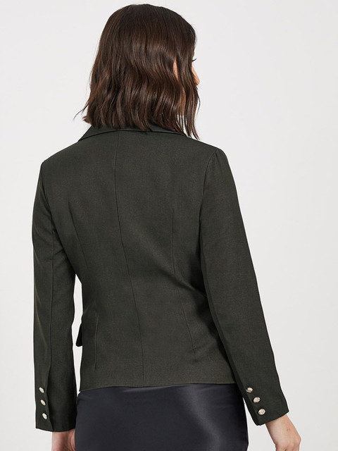 Olive-green solid regular-fit double-breasted blazer, has a Notched Lapel collar, button closure, long sleeves, two pockets, and ventless back hem