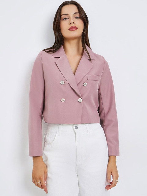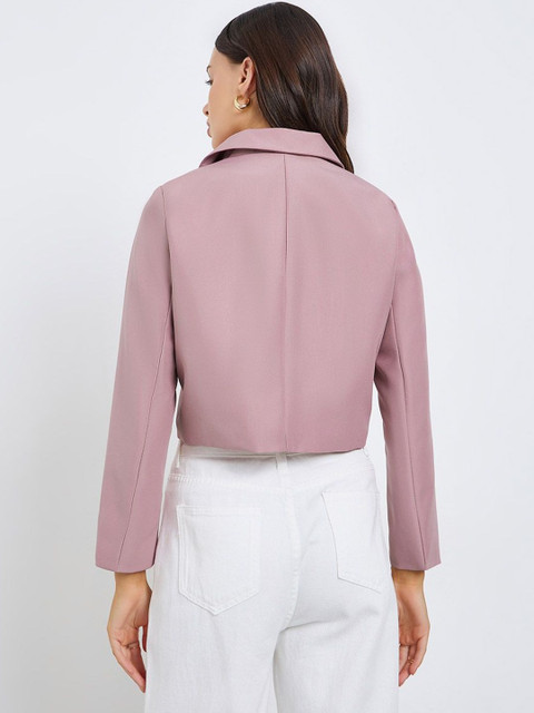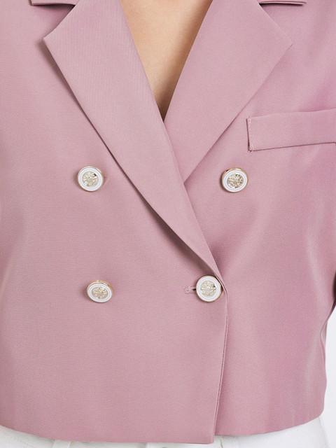 Pink solid casual blazer, has a notched lapel, long sleeves, double-breasted with button closure, one pocket and a ventless back hem