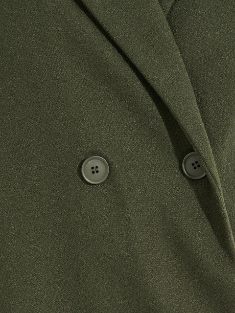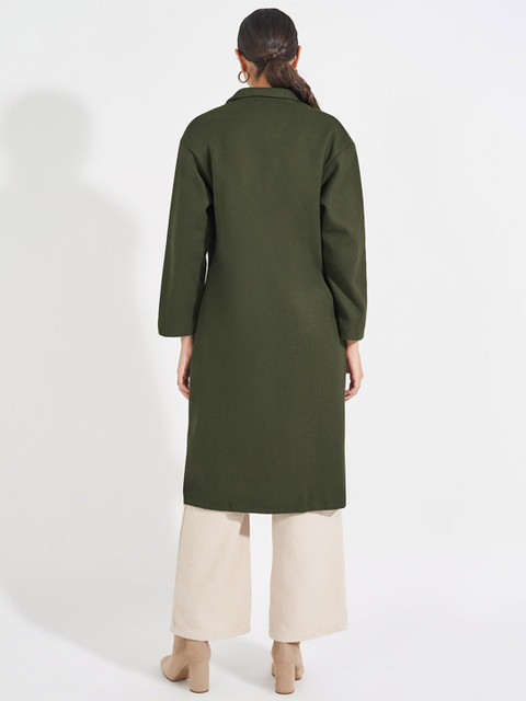 Olive green solid double-breasted knee length overcoat, has notched lapel collar, long sleeves, button closure and a straight hem