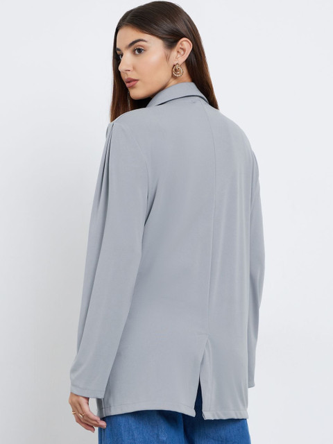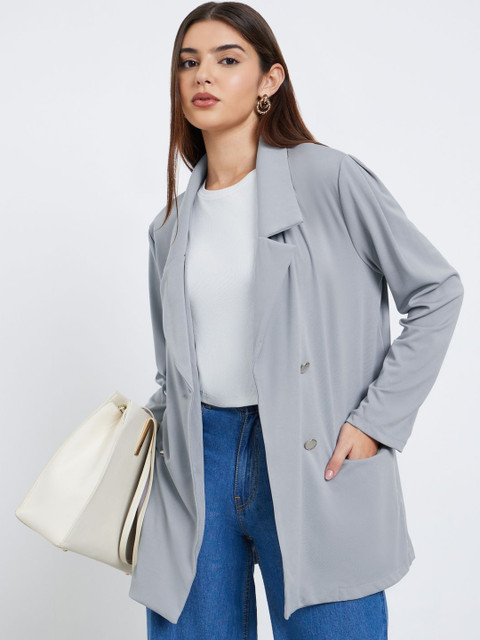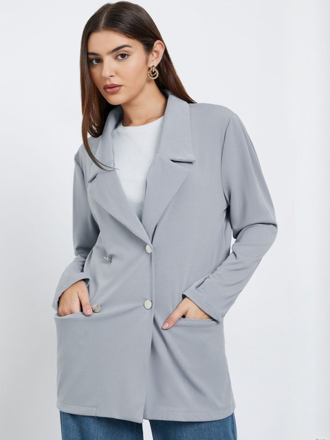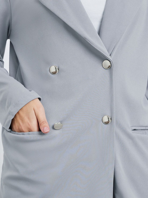 Grey self-design regular-fit casual blazer, has a notched lapel, long sleeves, double-breasted with double button closure, two flap pockets, and a ventless back hem