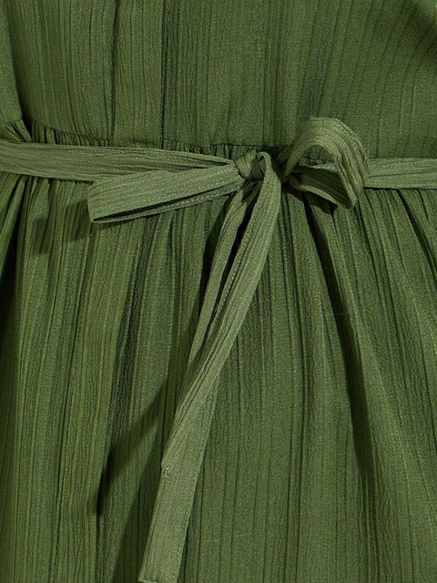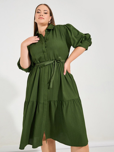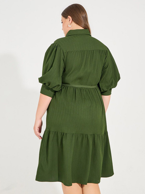 Enhance your wardrobe with the Styli Women Plus Olive Balloon Sleeve Shirt Midi Dress. Crafted from polyester and featuring a woven texture, this dress offers a chic shirt shape with a classic collar and solid pattern. The three-quarter balloon sleeves and flared hemline add a stylish touch, while the button closure and included belt ensure a flattering fit. Perfect for any occasion, this dress effortlessly combines style and comfort.