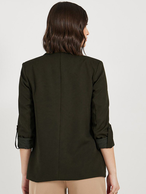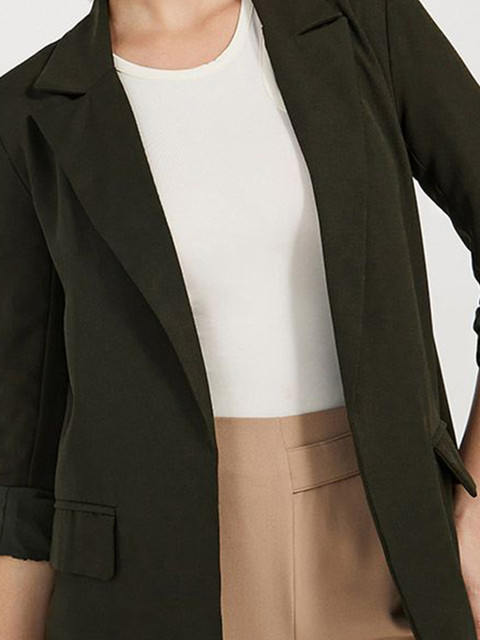 Olive solid regular-fit smart-casual blazer, has a notched lapel, Longline single-breasted long sleeves, two flap pockets