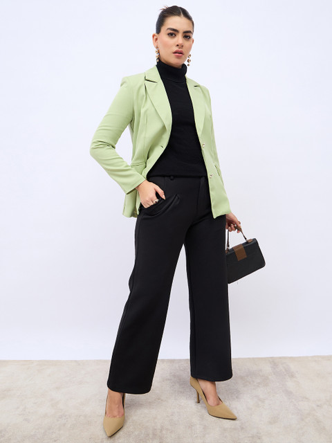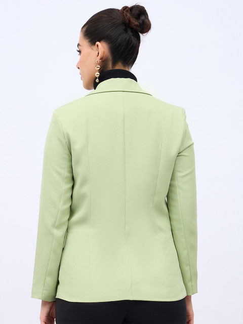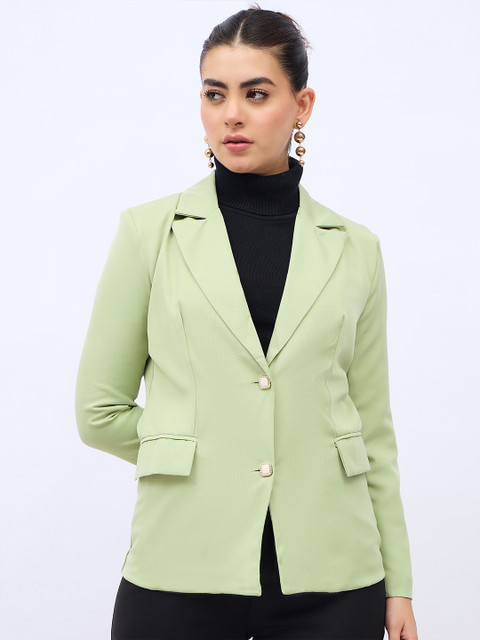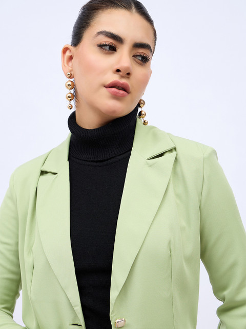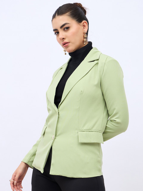 Green solid regular-fit single-breasted casual blazer, has a notched lapel collar, button closure, long sleeves, two pockets and vent-less back hem