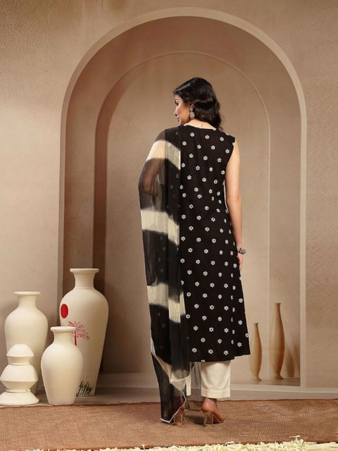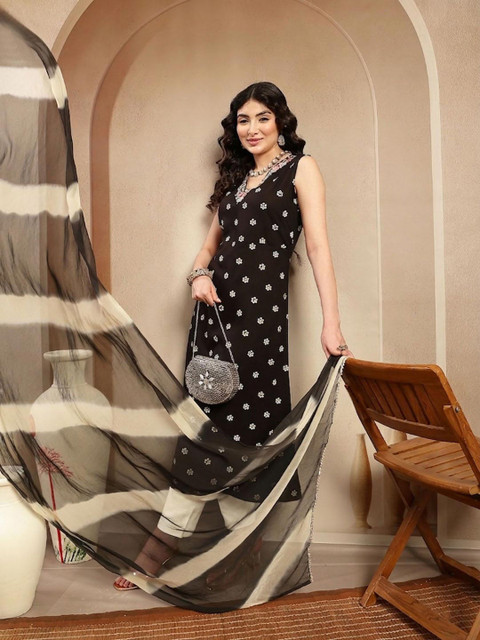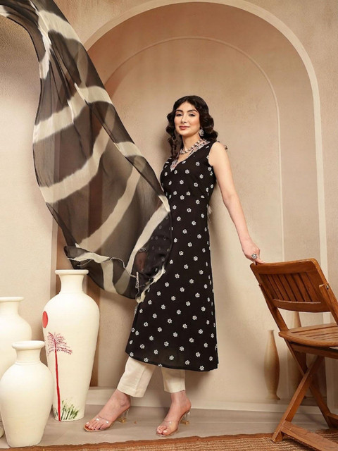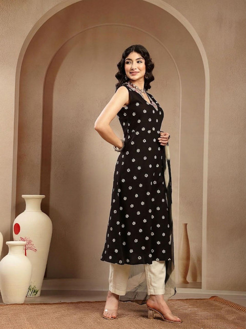 - Floral Printed & Embroidered Rayon A-Line Kurta With Dupatta