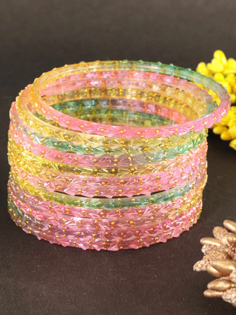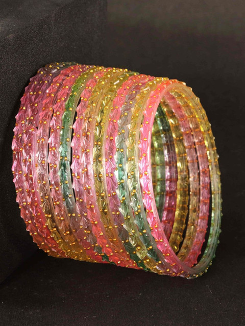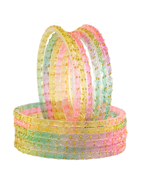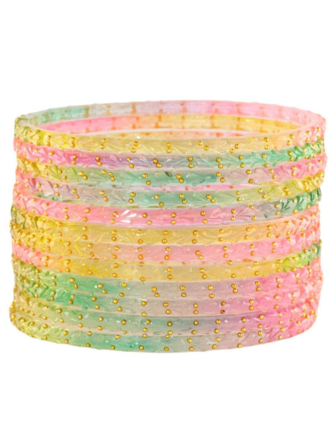 Set of 12 pink and green glass intricate textured detail bangles, each secured with slip-on closure