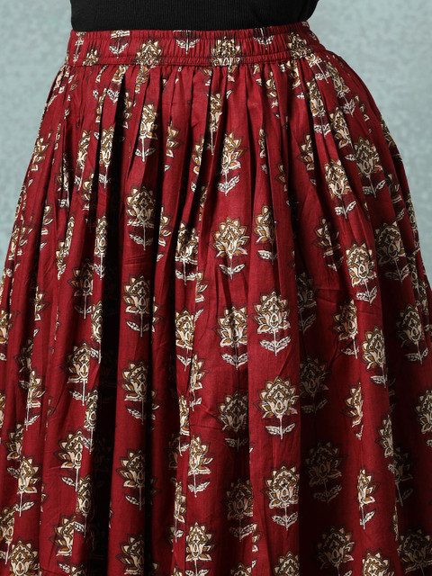 Maroon and beige floral printed flared maxi skirt, has an elasticated waistband with slip-on closure, and a flared hem