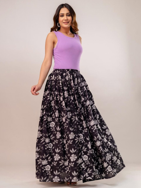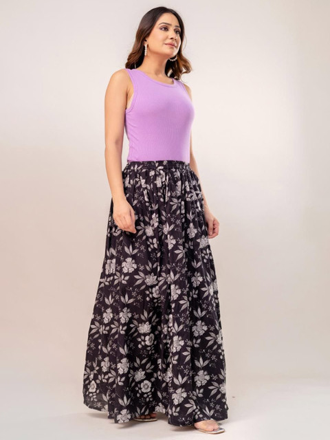 Black and white printed flared maxi skirt, has an elasticated waistband with slip-on closure, and a flared hem
