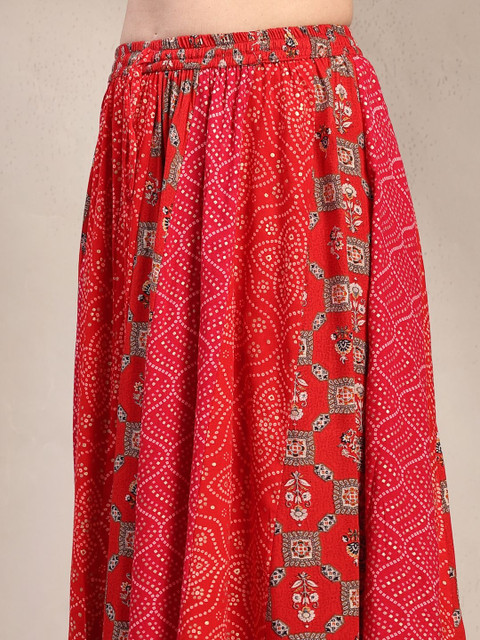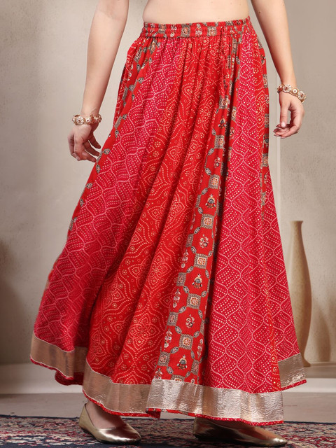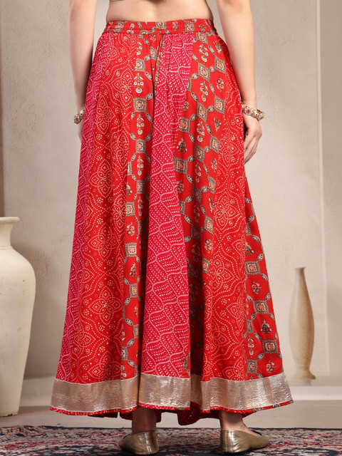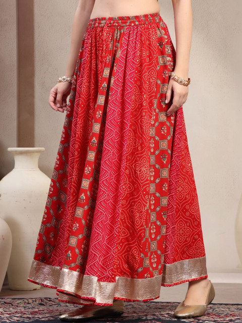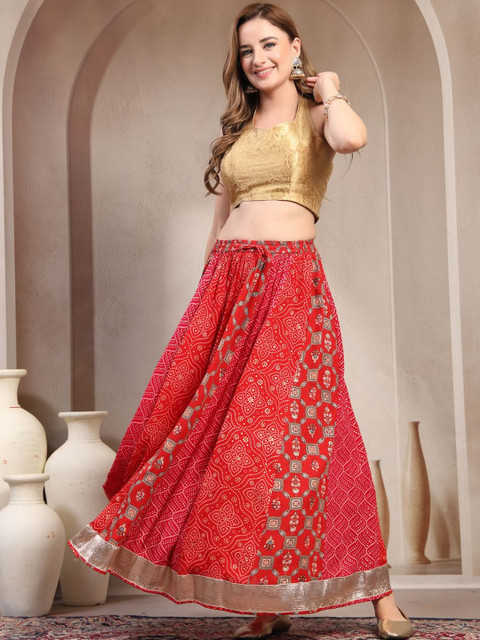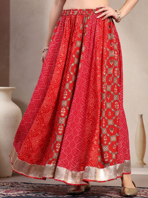 Red and gold-toned self-design flared maxi skirt, has an elasticated waistband with slip-on closure, and a flared hem
