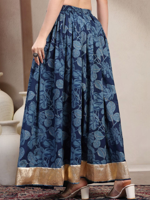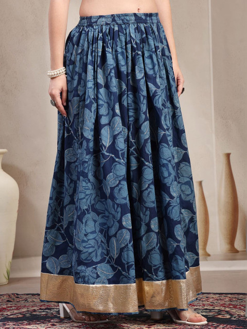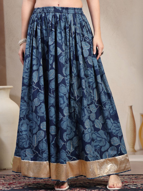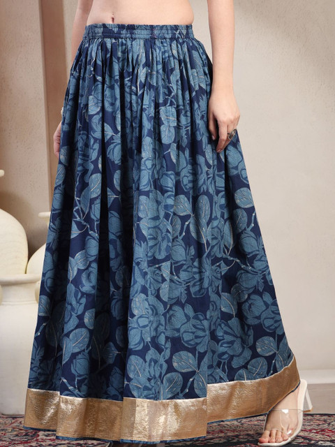 Blue and gold-toned self-design flared maxi skirt, has an elasticated waistband with slip-on closure, and a flared hem
