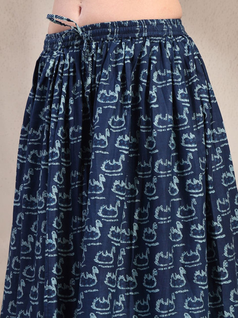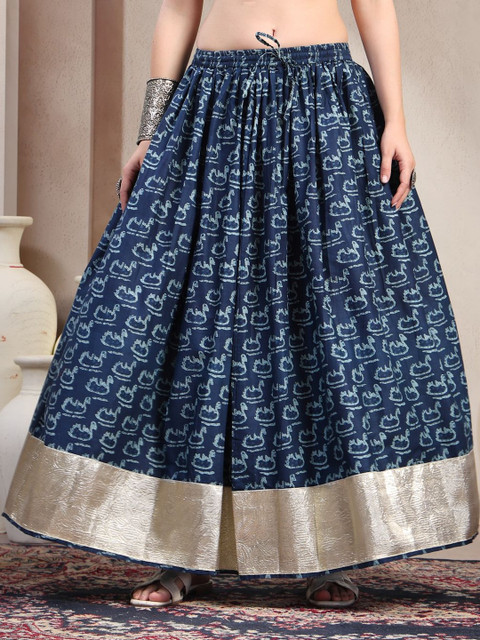 Blue and gold-toned self-design flared maxi skirt, has an elasticated waistband with slip-on closure, and a flared hem