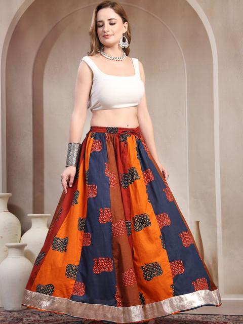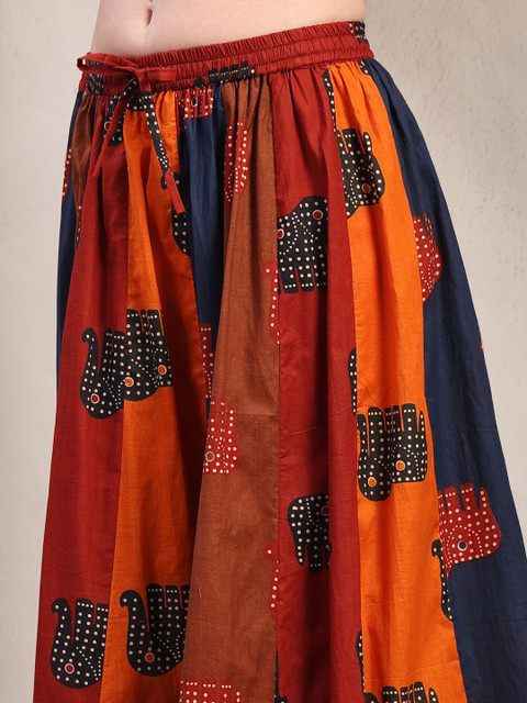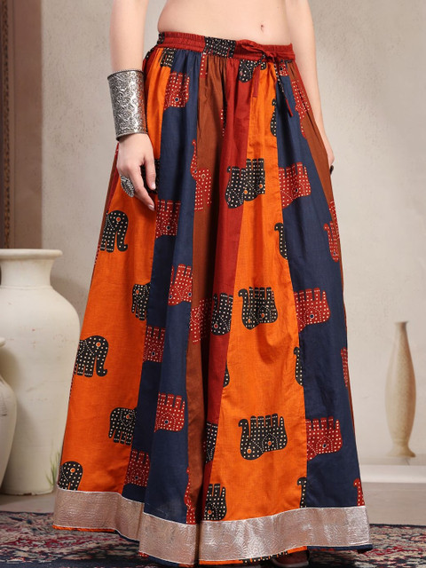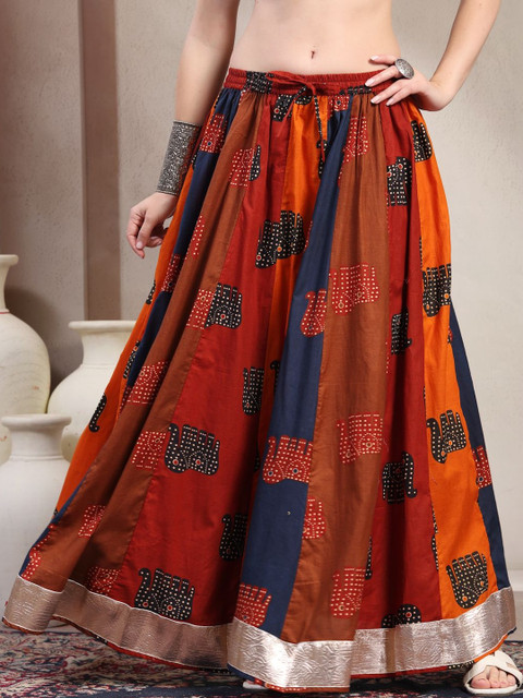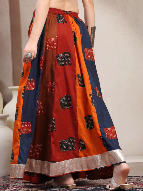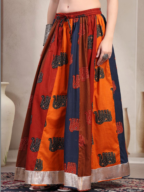 Red, navy blue and orange-colored and gold-toned self-design flared maxi skirt, has an elasticated waistband with slip-on closure, and a flared hem