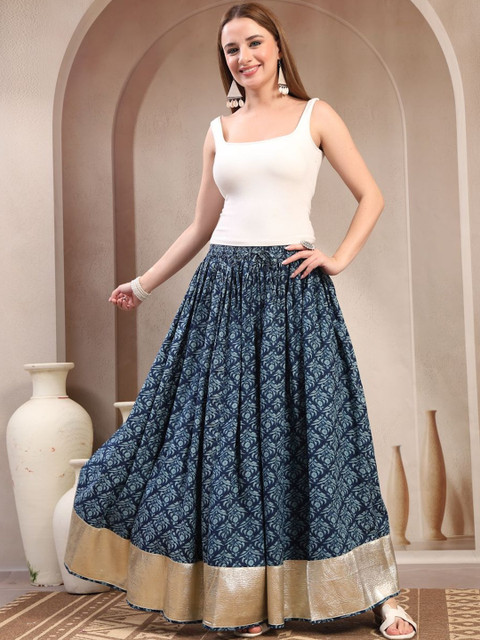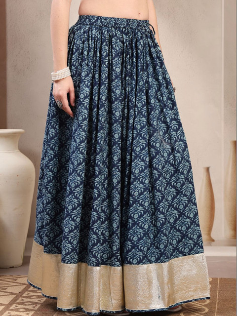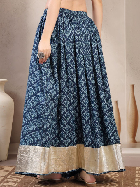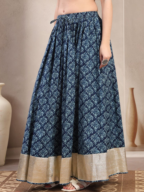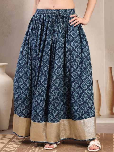 Blue and gold-toned self-design flared maxi skirt, has an elasticated waistband with drawstring closure, and a flared hem