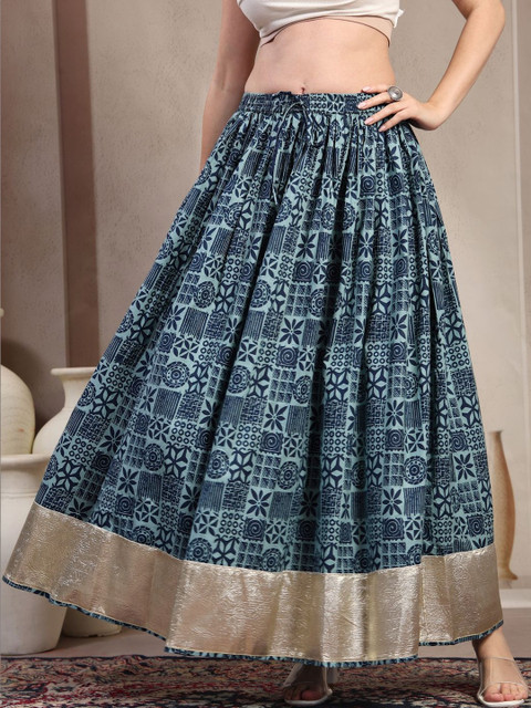Blue self-design flared maxi, has an elasticated waistband with drawstring closure, and a flared hem