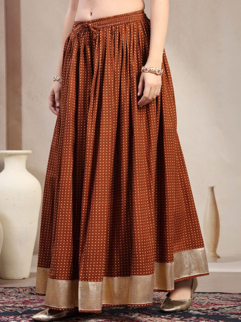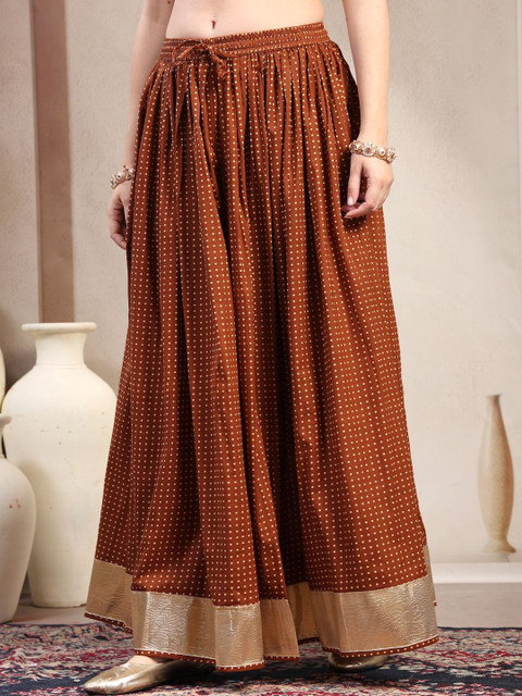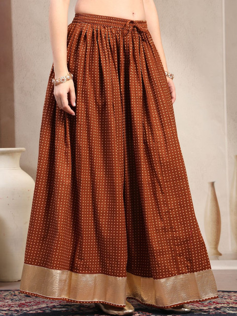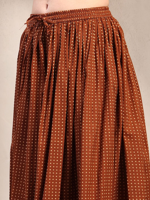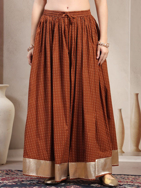 Brown self-design flared maxi, has an elasticated waistband with drawstring closure, and a flared hem