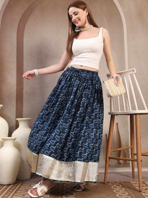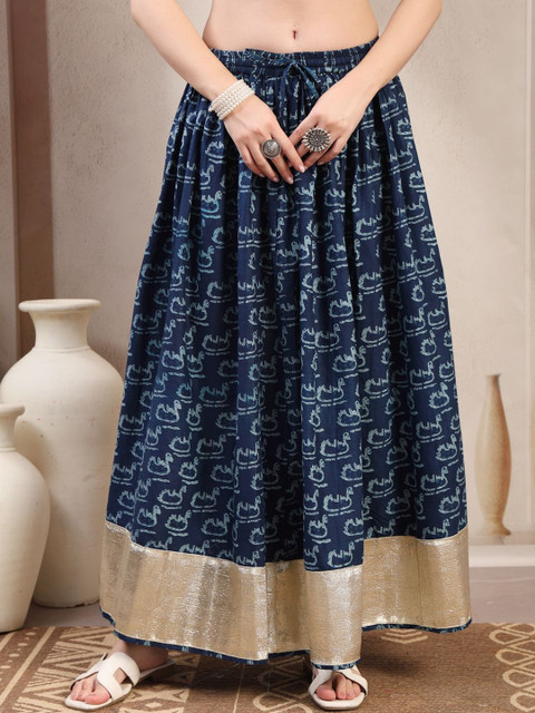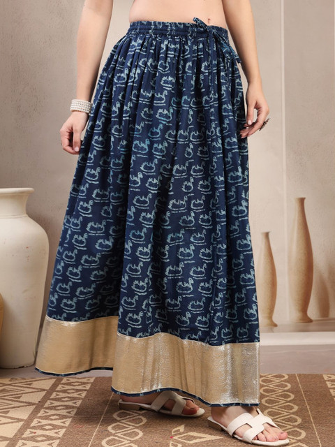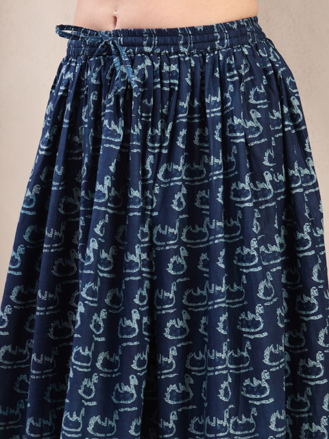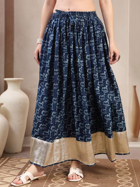 Blue self-design flared maxi, has an elasticated waistband with drawstring closure, and a flared hem