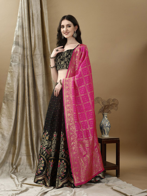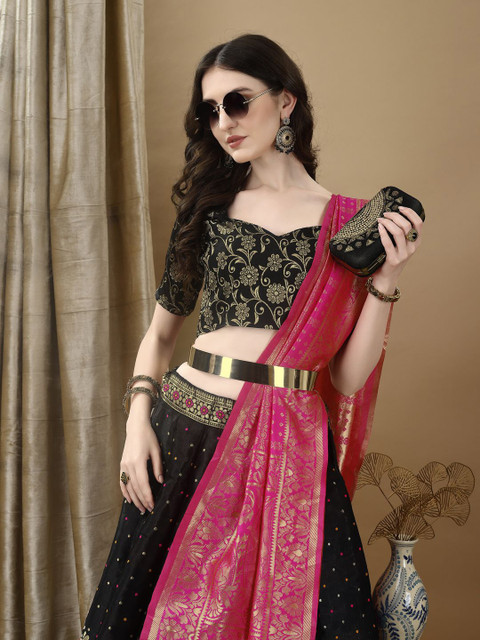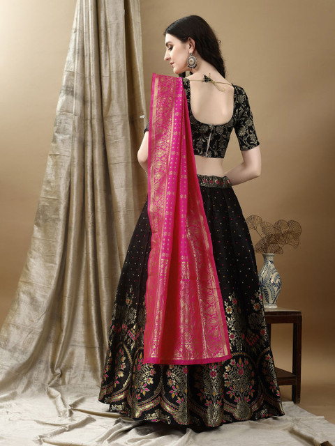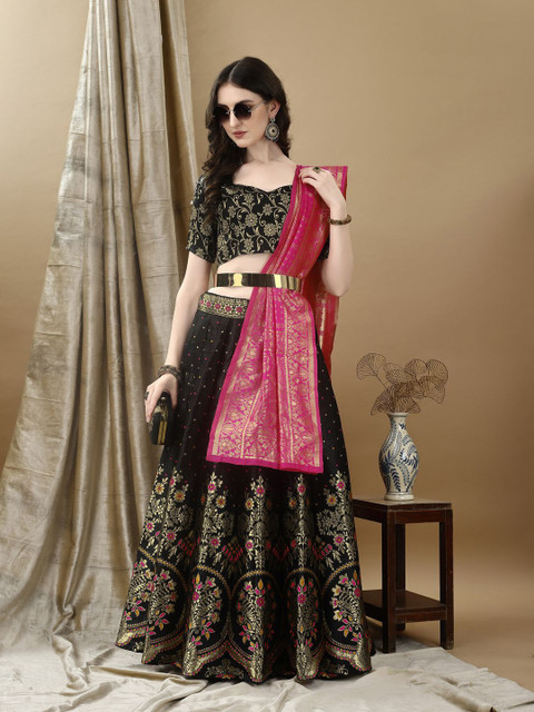 Black and pink floral woven design lehenga choli with dupatta, zari