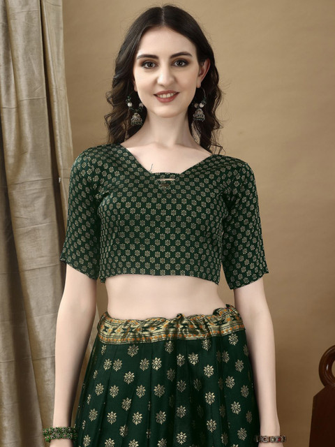 Green and mustard woven design unstitched blouse, has a round neck, short sleeves, green and mustard woven design ready to wear lehenga, flared hem