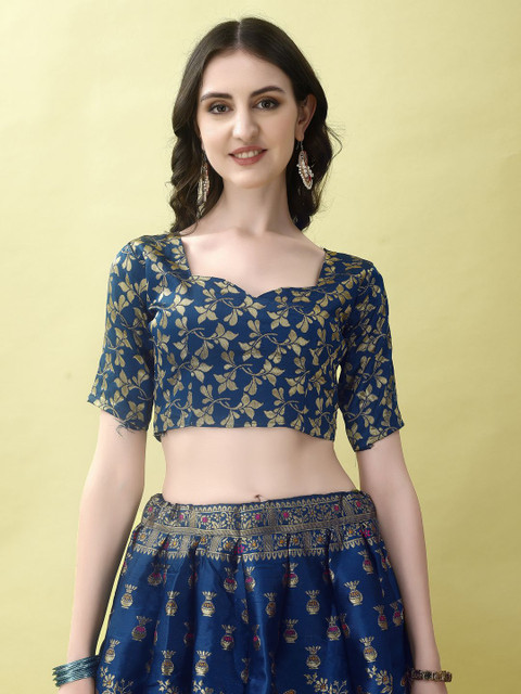 Blue and pink woven design unstitched blouse, short sleeves, blue and pink woven design ready to wear lehenga, flared hem