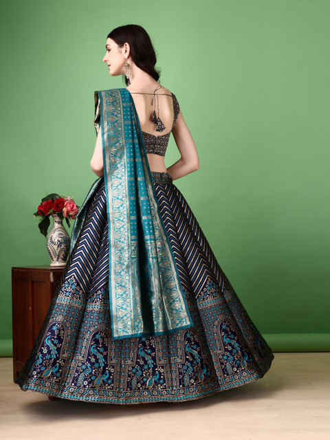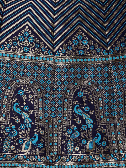 Blue and silver-toned woven design unstitched blouse, has a round neck, short sleeves, blue and silver-toned woven design ready to wear lehenga, flared hem