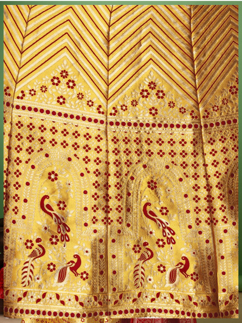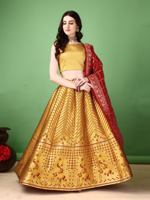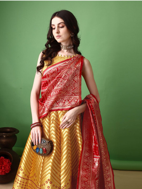 Gold-toned and red woven design lehenga choli with dupatta, zari