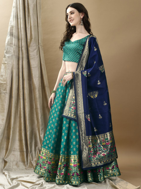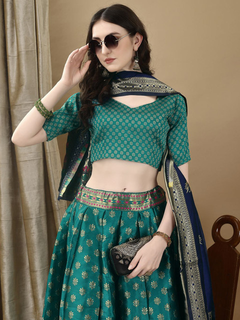 Teal and gold-toned woven design lehenga choli with dupatta, zari