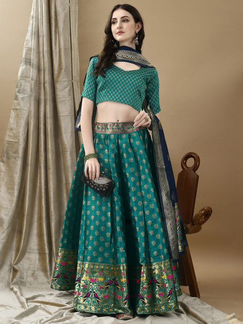 Teal and gold-toned woven design unstitched blouse, has a round neck, short sleeves, teal and gold-toned woven design ready to wear lehenga, flared hem