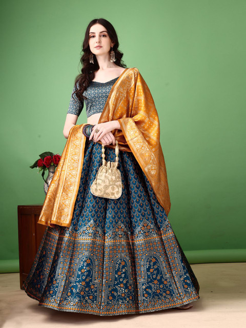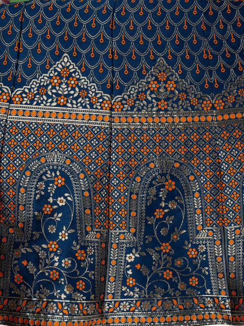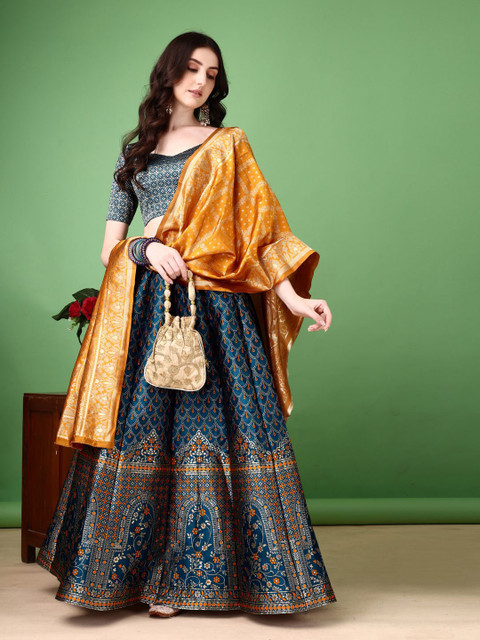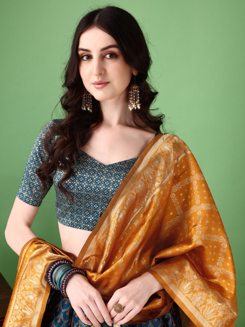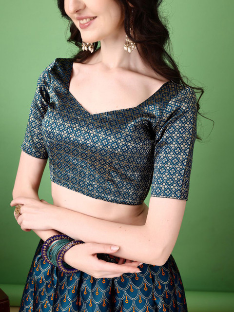 Green and yellow woven design unstitched blouse, has a round neck, short sleeves, green and yellow woven design ready to wear lehenga, flared hem