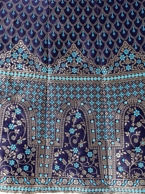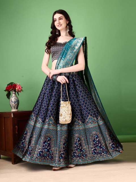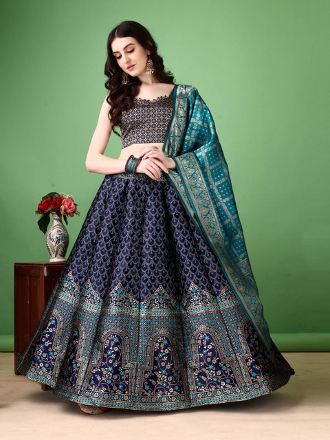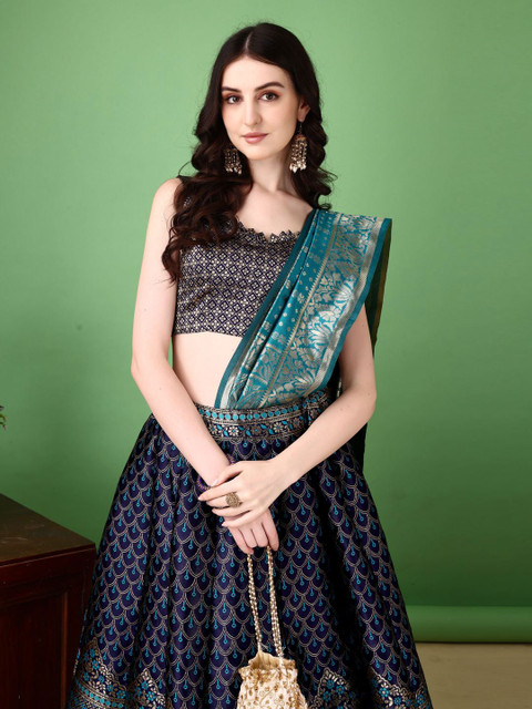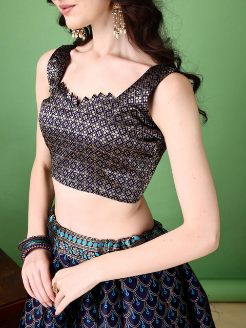 Blue and silver-toned woven design unstitched blouse, has a round neck, short sleeves, blue and silver-toned woven design ready to wear lehenga, flared hem