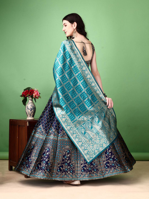 Blue and silver-toned woven design lehenga choli with dupatta, zari
