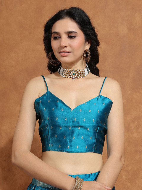 Turquoise blue and gold woven design unstitched blouse, has a v-neck, sleeveless, turquoise blue and blue woven design semi-stitched lehenga, flared hem