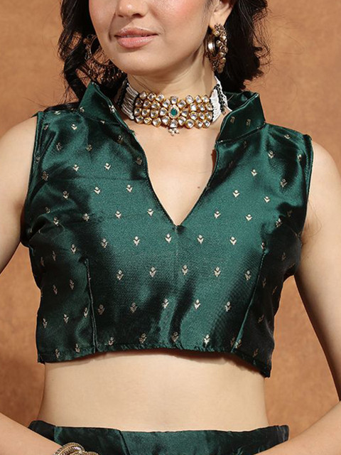 Green and gold woven design unstitched blouse, has a v-neck, sleeveless, green and gold woven design semi-stitched lehenga, flared hem