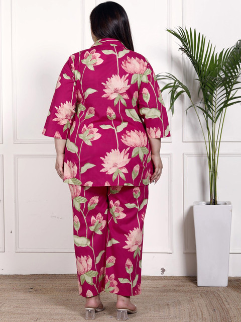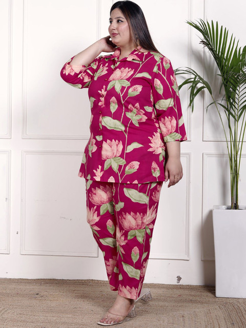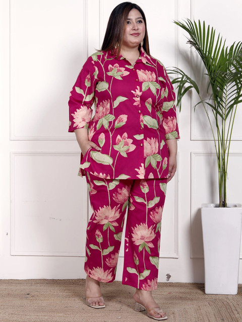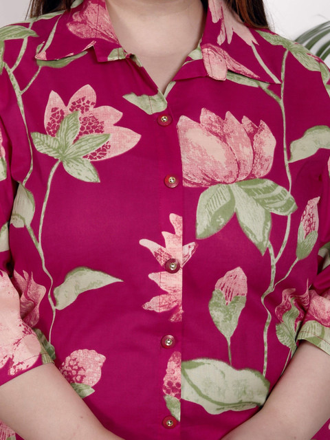 Pink and green floral printed shirt, has a shirt collar neck and three quarters sleeves, secured with button closure