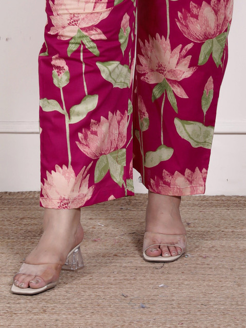 Pink and green floralprinted trousers, has an elasticated waistband with slip-on closure has 2 pockets