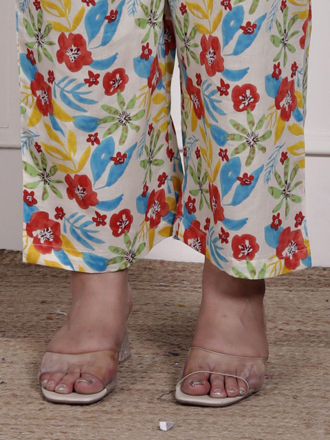 Off white printed trousers, has an elasticated waistband with slip-on closure has 2 pockets