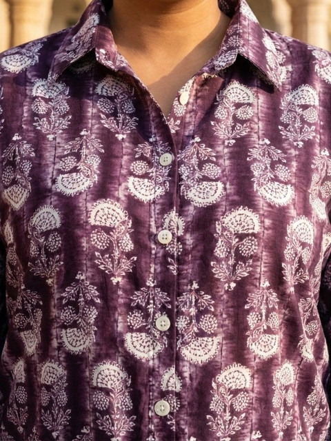 Purple and Printed Shirt Shirt Collar, Three-quarter Sleeves