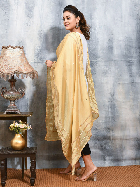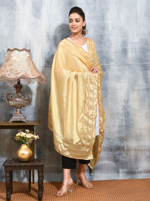 Yellow and gold-toned striped embroidered dupatta, gotta patti border