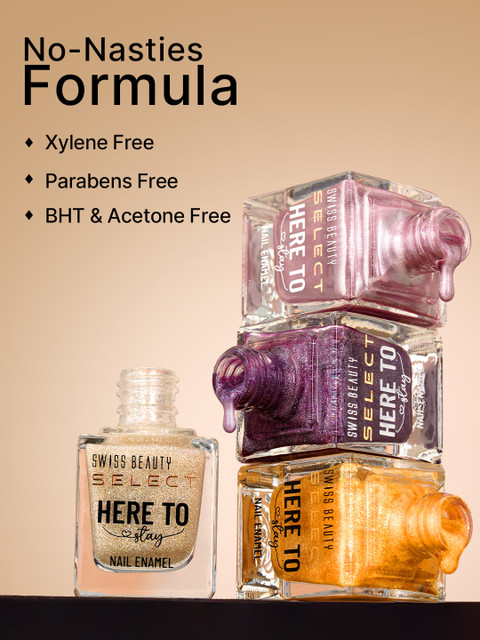 | Special Features | Super-rich and Glossy Finish – The Swiss Beauty Select Here to Stay Nail Enamels have an intensely rich texture and a high-gloss finish that exudes elevated glamour and provides a salon-like look.One-Coat Coverage – One coat is all it takes to provide your nails with opaque and sweeping coverage.Waterproof and Long-lasting – These nail enamels have an incredibly extensive wear time because of their waterproof and long-lasting formula.Non-stain Chip Resistance – Say goodbye to chipped and unkempt nails with the non-stain and chip resistance formula of the Swiss Beauty Select Here to Stay Nail Enamels.No-Nasties Formula – These nail enamels are free of nasties, such as xylene, camphor, parabens, BHT, acetone, etc. |
