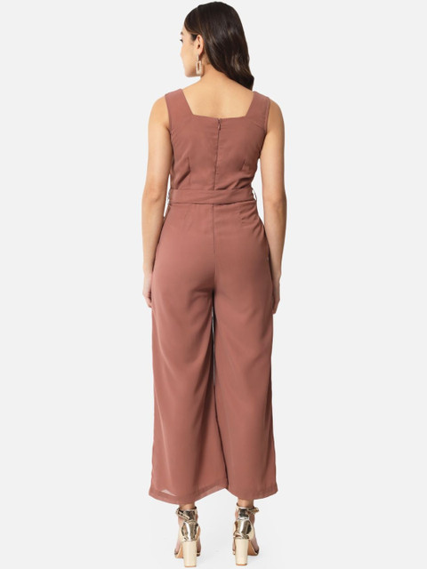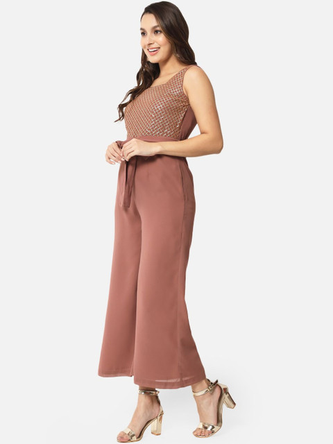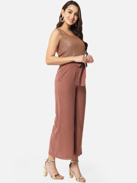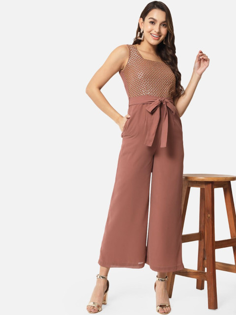 Brown self design basic jumpsuit with embellished ,has a square neck, sleeveless, 2 pockets