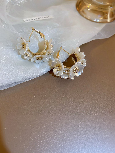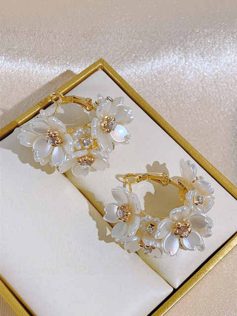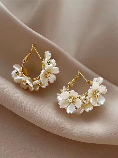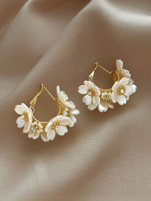 Gold-toned floral hoop earrings, gold-plated, has pearls