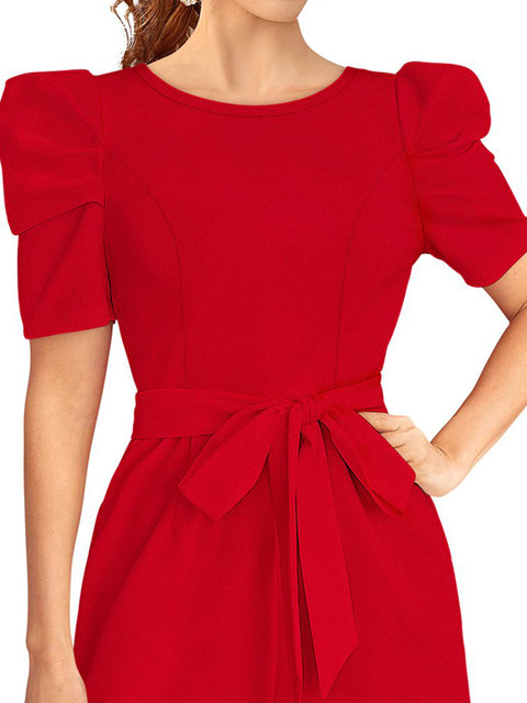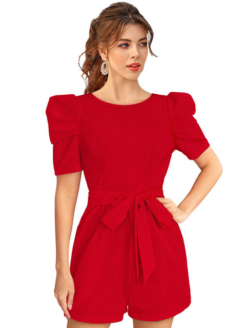 Red solid playsuit ,has a round neck, short sleeves, na pockets