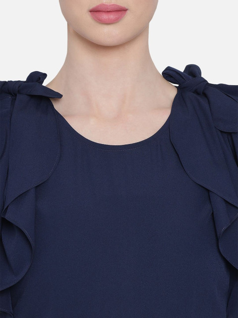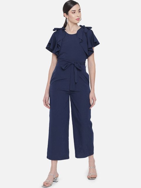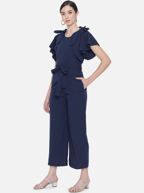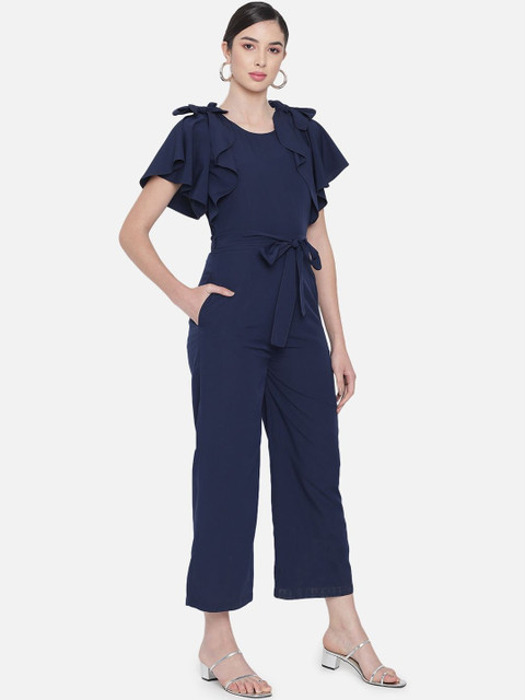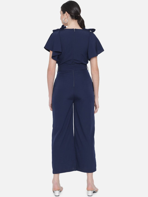 Navy blue solid basic jumpsuit with ruffles ,has a round neck, short sleeves, 2 pockets