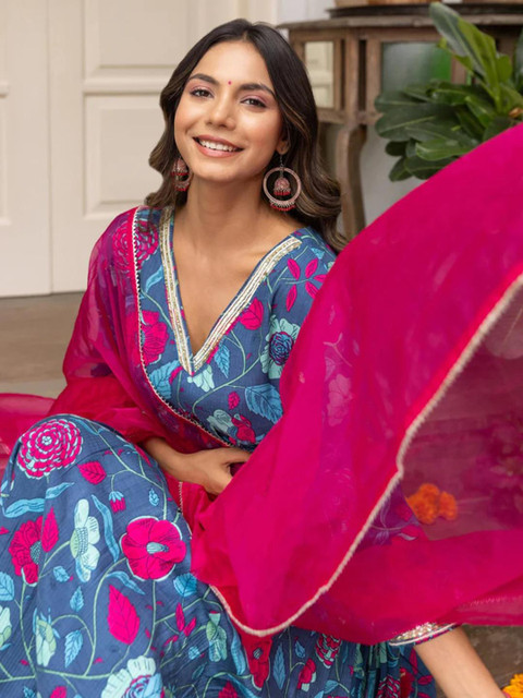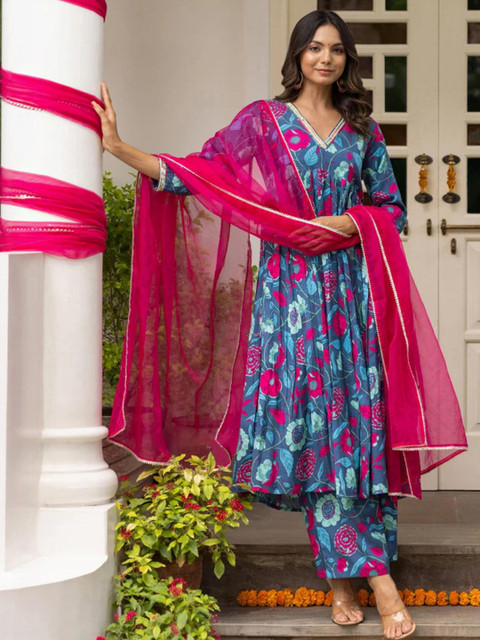 Kurta Set Fabric :-Cotton Blend ||This set includes: 1 Kurta and 1 Pant with Dupatta || Work :- Printed||Neck Style:- V-neck|| Style:- Anarkali|| Length: Calf Length|| Sleeves: 3/4 Sleeves